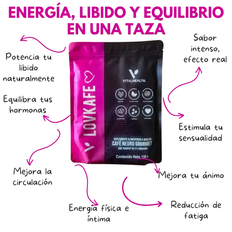 LovKafe by VitalHealth is a gourmet black coffee designed to transform your daily routine into a ritual of energy, vitality, and well-being. Its formula combines high-quality Arabica coffee with functional ingredients such as Tongkat Ali, Maca, Ginseng, and L-Arginine, recognized for their ability to increase energy, improve circulation, and support hormonal health.
