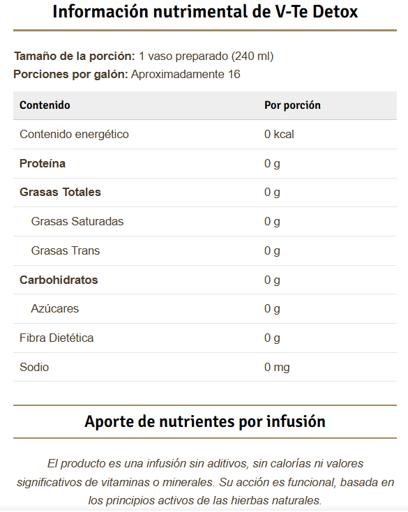 V-Te Detox Nutritional Information