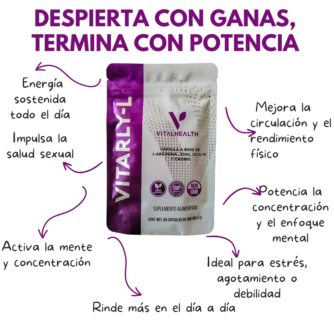 Vitarly-L is a supplement designed to boost your energy, physical performance, and daily well-being. Its advanced formula combines natural stimulants, amino acids, and essential minerals that work synergistically to combat fatigue, improve concentration, and optimize your cardiovascular health. It’s the perfect ally for active and demanding lifestyles.