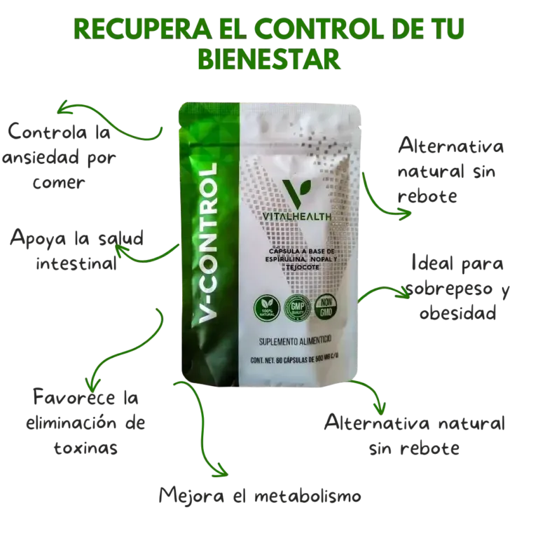 V-Control es un suplemento formulado para ayudarte a controlar el apetito, reducir la ansiedad y optimizar tu metabolismo de forma natural. Su combinación de ingredientes funcionales lo convierte en la herramienta perfecta para quienes buscan un camino sostenible hacia sus objetivos de bienestar.
