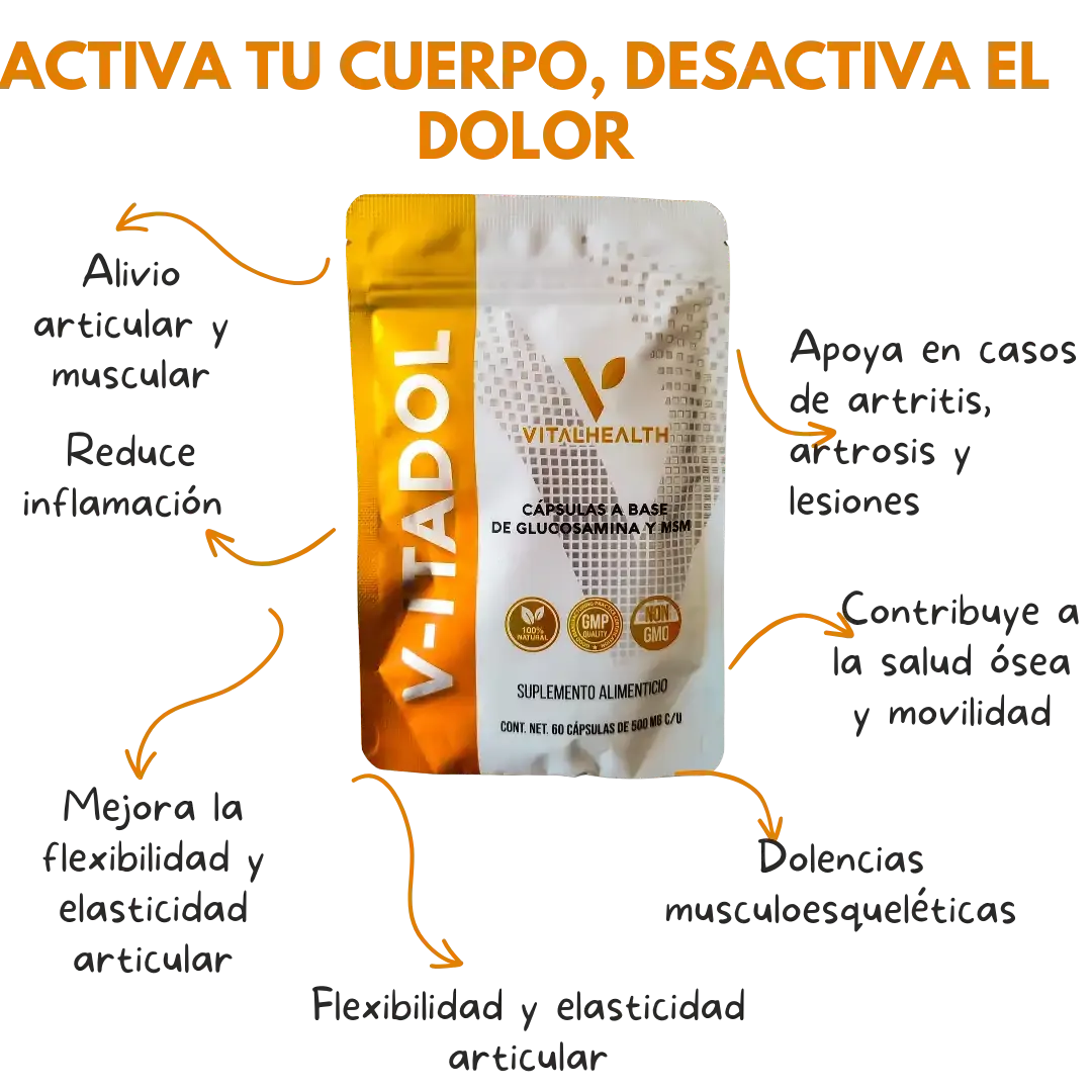 • Fórmula Natural y Segura: Con ingredientes respaldados por la ciencia como la glucosamina y el MSM, V-Itadol ofrece un alivio sin efectos secundarios agresivos.